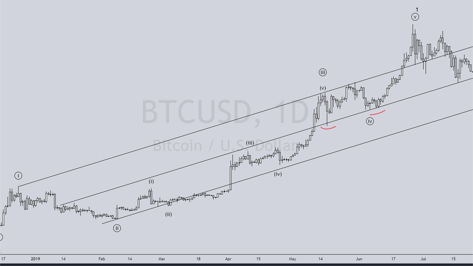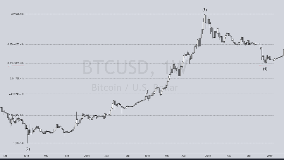 Usually the wave 4 of an impulsive wave retraces down to 0.382 of the third wave. This is how the 2018 bottom was predictable.